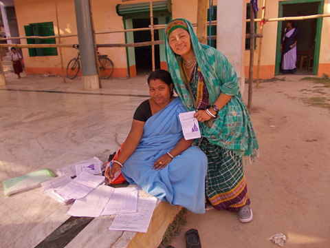 Si Ishani Devi Dasi ay nagbibigay ng pamplet sa isa sa mga lokal na titser sa