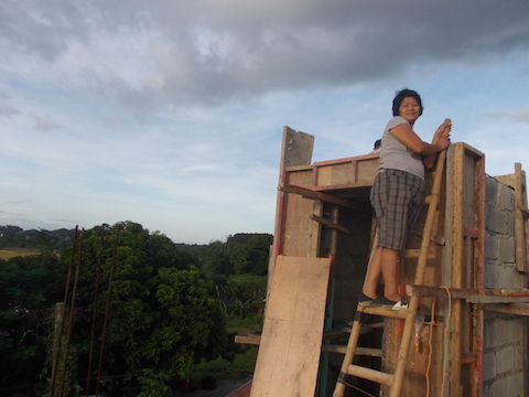 Tinitignan mabuti ni Ishani Devi Dasi ang ginawang bubong ng hagdanan.