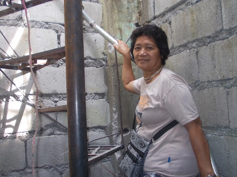 Tinitignan mabuti ni Ishani Devi Dasi ang ginawang bubong ng hagdanan.