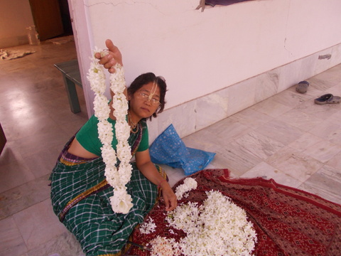 Si Ishani Devi Dasi ay gumagawa ng kuwintas na bulaklak para kay Sri Sri Guru